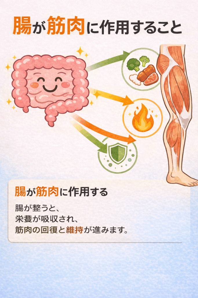 腸の調子が悪いと、十分に食事をしていても栄養が吸収されにくくなり、筋肉の回復や維持が進みません。