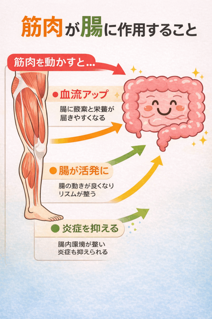 人の体は、筋肉・腸・神経がそれぞれ独立して働いているわけではありません。筋肉を使うことで血流や神経の働きが変化し、その影響が腸にも及びます。
